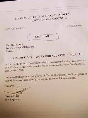 Management of the Federal College of Education, Okene has issued a circular to all staff regarding the resumption of work.