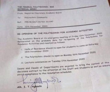 The management of Federal Polytechnic Ede (Ede Poly) has fixed Monday 12th October 2020 as the resumption date for all staff of the school to complete 2019/2020 academic activities.