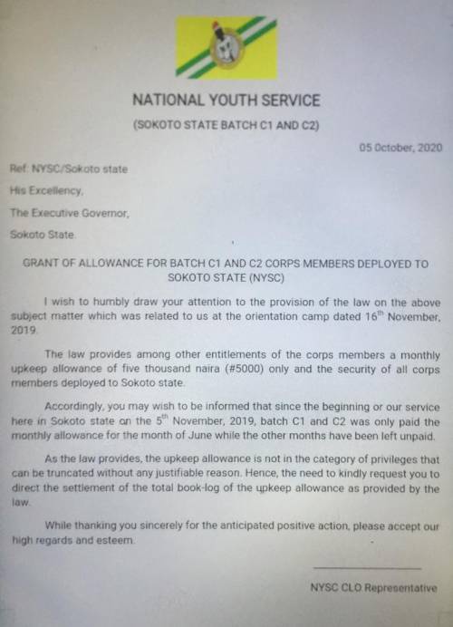 “Accordingly, you may wish to be informed that since the beginning of our service here in Sokoto State on the 5th November, 2019, batch Cl and C2 were only paid the monthly allowance for the month of June while the other months have been left unpaid.